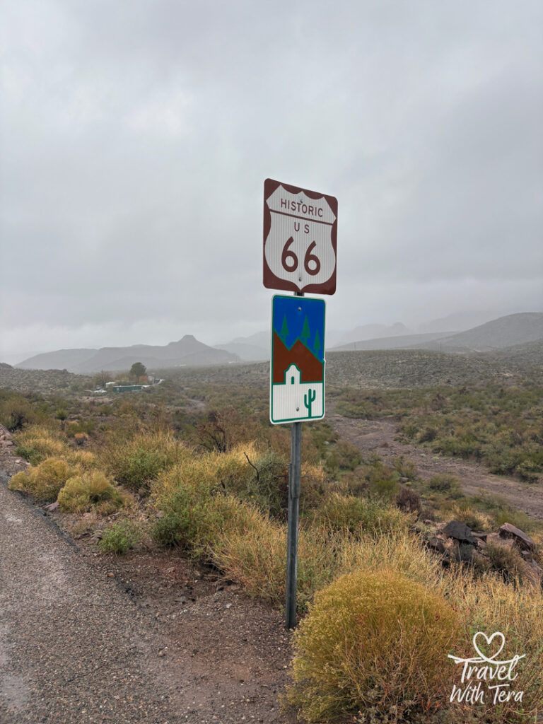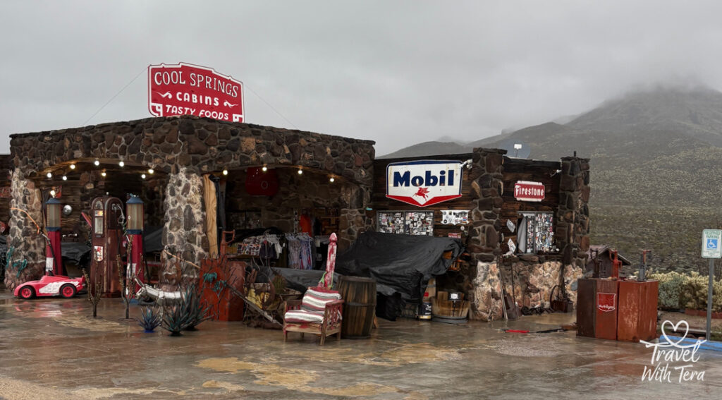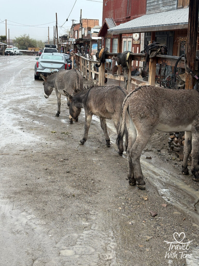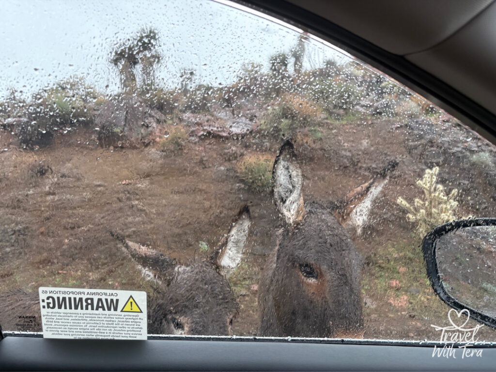 Leaving Little America Hotel Flagstaff was bittersweet— the four days and three nights we spent here were so comfortable and we loved our stay . From Flagstaff, we began the drive back toward Los Angeles by taking I-40 West before reconnecting with stretches of historic Route 66, eventually heading toward the tiny desert town of Oatman. The weather shifted dramatically that day—foggy and rainy, with the landscape turning unexpectedly lush and green compared to the dry desert tones we’d seen earlier in the trip. As we navigated the winding mountain roads, especially ascending Sitgreaves Pass, make sure to use extra caution since the curves can be steep and slick in the rain. Along the way, I was DELIGHTED to encounter wild donkeys casually roaming the roads—friendly, curious, and completely unbothered by passing cars!