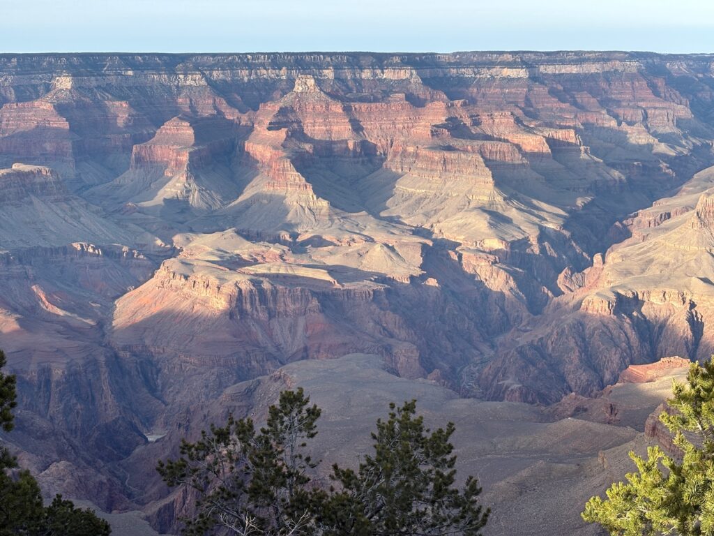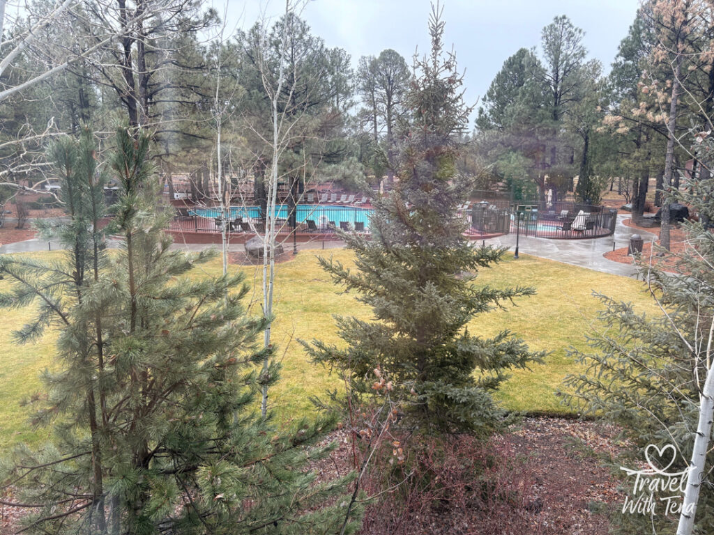 We stayed at Little America Flagstaff Hotel, which was the perfect mountain retreat after a long drive. We arrived at 2 am and the pine trees were glowing with red green and blue Christmas lights. So festive and pretty! Surrounded by tall pines, the property has a cozy lodge atmosphere with spacious, comfortable rooms, an inviting lobby with fireplaces, and peaceful walking paths around the grounds. It’s quiet, scenic, and still conveniently located near town for dining and essentials. From the hotel, the South Rim of the Grand Canyon is about a 1.5-hour drive north via Highway 180 or US-64. The route is incredibly scenic, especially as you approach the national park entrance.