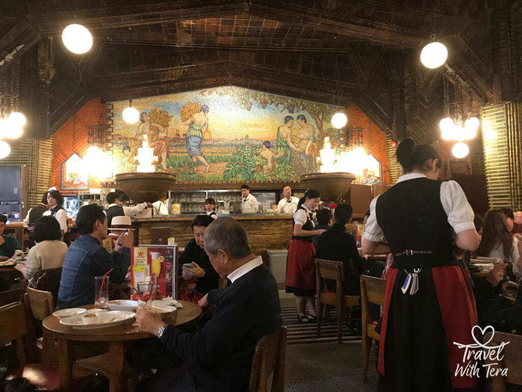 Ginza is so elegant and nice to stroll around in. In December it’s cold and snowing but Ginza is so calm and pretty with beautiful parks. The Imperial Palace is there you have to see the garden and the grounds. We also stopped into the Ginza Lion Beer Hall which we stumbled upon by mistake ! We were looking for a warm place to recharge ourselves since it was mid afternoon and we had been up early sightseeing hard ! As soon as we walked it we loved the vibe. I mean it’s a beer hall so you’re bound to find jovial people sipping – chugging – enjoying Japan’s beer and we decided to join in. Cold Sapporo and crispy Tonkatsu hit the spot ..